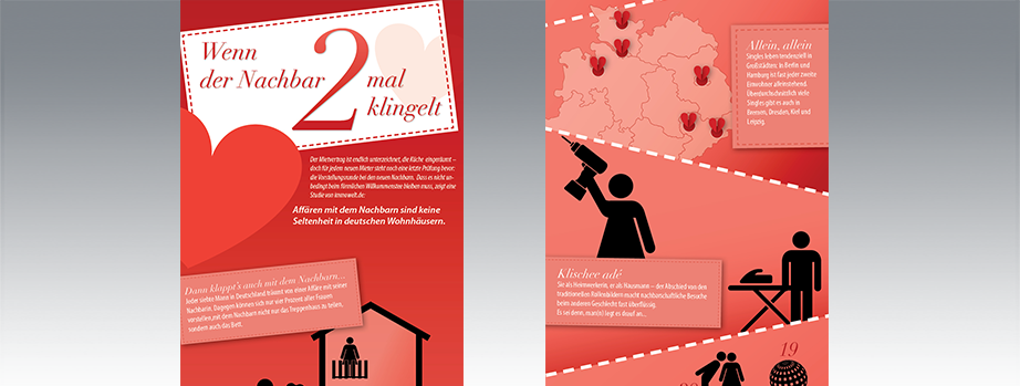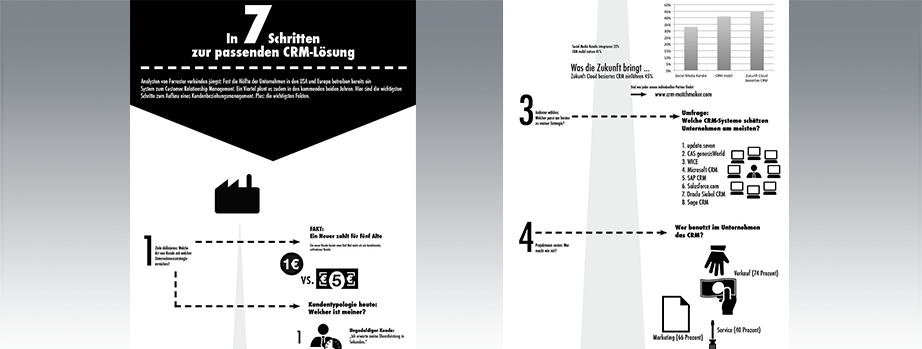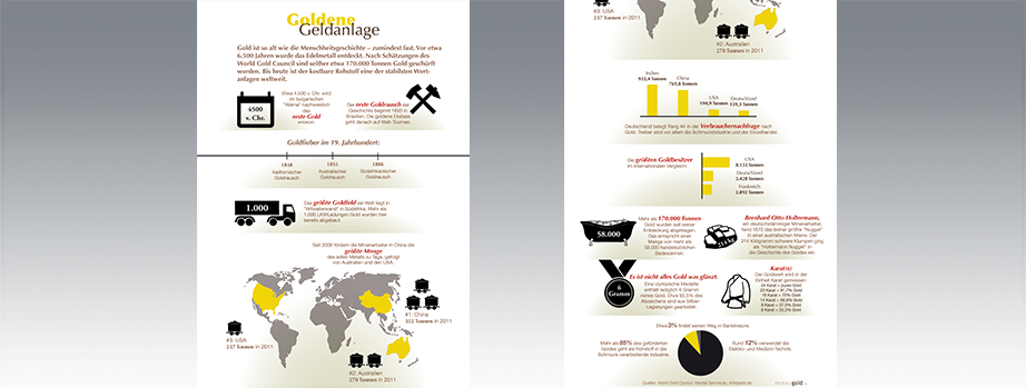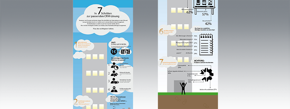 Der Auftrag war, für die Webseiten verschiedener Kunden ansprechende Infografiken zu gestalten. Durch entsprende Visualisierung soll der Betrachter in kurzer Zeit und auf angenehme Art und Weise gehaltvolle Informationen konsumieren und