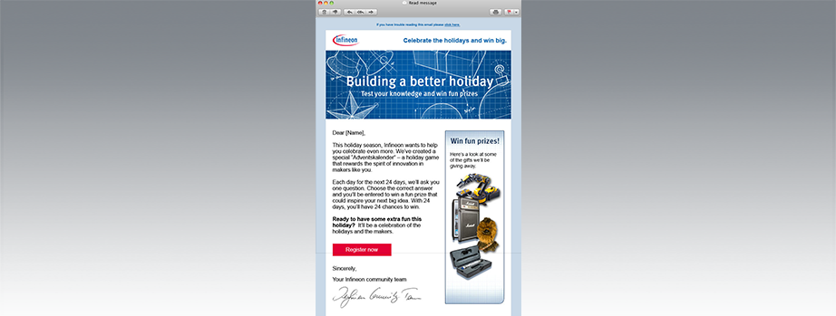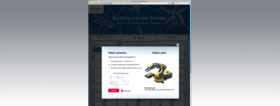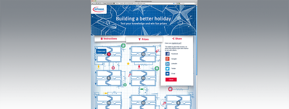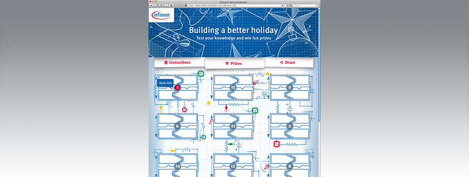 Der Auftrag hinter dieser Arbeit war, für die Infineon Techlologies AG einen interaktiven Online-Advents-kalender zu gestalten, der die Zielgruppe der Ingenieure anspricht und sich optisch im Rahmen der CI-Guidelines des Unternehmens bewegt. Der Header, sowie die 24 Türchen des Adventskalenders, sollen optisch an Blueprint-Skizzen bzw. technische Zeichnungen erinnern, mit denen Ingenieure täglich zu tun haben.